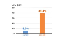 それから毎年レビューキャンペーンを実施するようになり、レビュー獲得件数は右肩上がり、それに合わせるように売上も伸びていっています。以下のグラフは、レビュー対策実施前の2017年と、直近の2021年のレビュー投稿率を比較したものです。このデータからもレビュー特典プレゼントキャンペーンの有効性がお分かりになるかと思います。