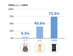 お客様が購入した当社の五月人形と一緒に飾れる「木札」や「名前旗」は、商品(五月人形)との関連性が高く、ともに40%を超えるレビュー投稿率をたたき出しました。名前旗にいたっては73.9%と、商品を購入したお客様の約4人に3人がレビューを書いてくれています。一方で、その2点と比べ投稿率が低かった「ビブ(よだれかけ)」は、赤ちゃんの必需品ではあるものの、節句のお祝いとは相関しないためこのような結果になったのではと推察できます。