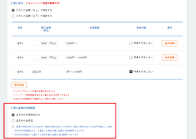 「注文内の対象商品のみ」にチェックを入れると、キャンペーン対象商品のみの金額を「購入金額」とします。