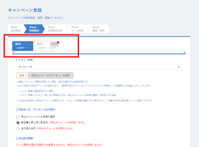 step2特典設定 にて、購入条件ごとにタブを切り替えてレビュー特典を設定してください。