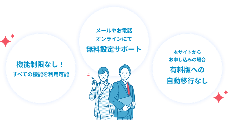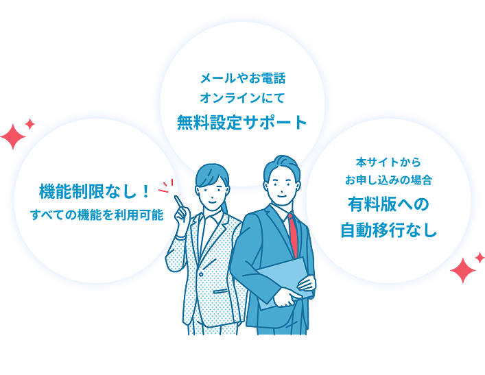 ※お申し込み頂いた月の翌月末まで ご利用いただけます。(例)8月15日にお申し込み頂いた場合、9月30日まで無料トライアルをご利用可能です。